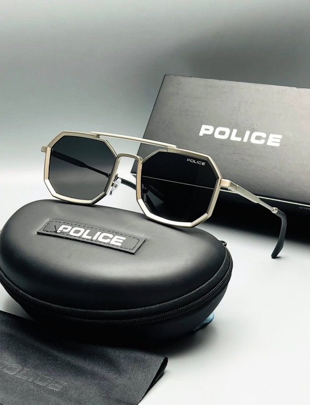 عینک آفتابی برند Police با طراحی هندسی مدرن و فریم فلزی هشتضلعی، مناسب استایلهای روزمره و شهری است.